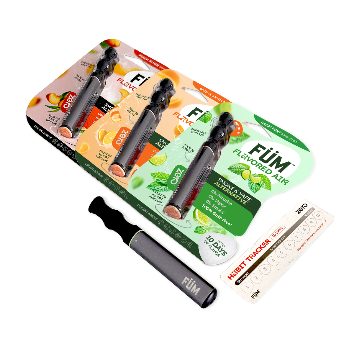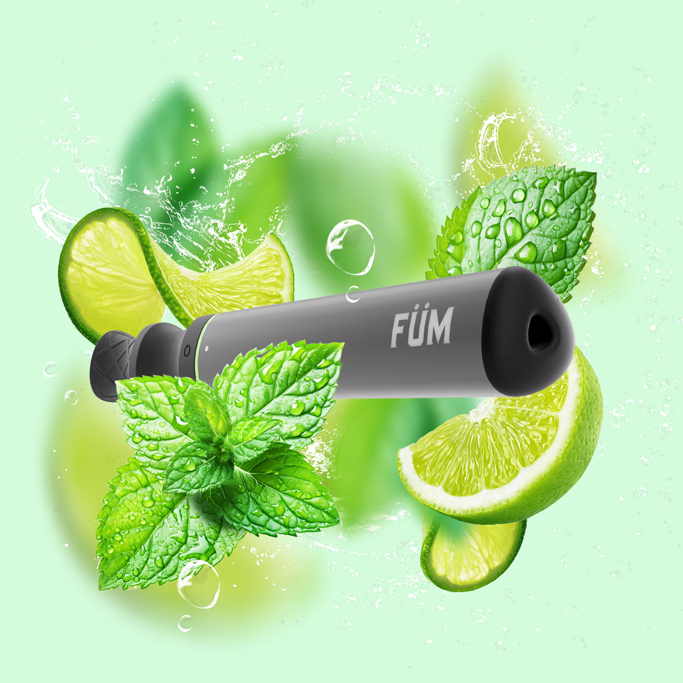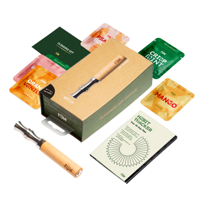 • A flavored air device with a maple barrel and stainless steel mouthpiece, branded with the name 'FÜM'.